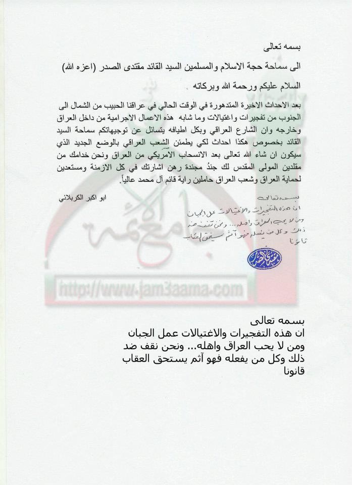 الموقف من احداث التفجيرات والاغتيالات الاخيرة في عراقنا الحبيب استفتاء للسيد القائد مقتدى الصدر اعزه الله 30 - 10 - 2011