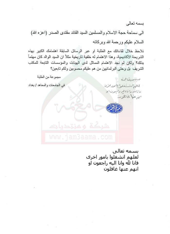اهتمام السيد القائد مقتدى الصدر بشريحة الاكاديميين استفتاء للسيد القائد مقتدى الصدر 31/10/2011