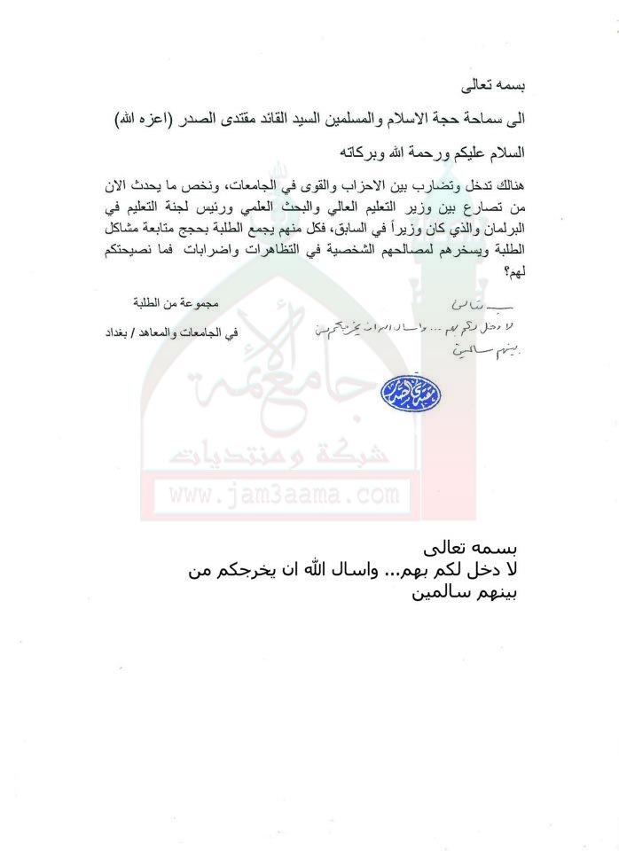 تدخل الاحزاب والقوى السياسية في الجامعات استفتاء للسيد القائد مقتدى الصدر 31/10/2011