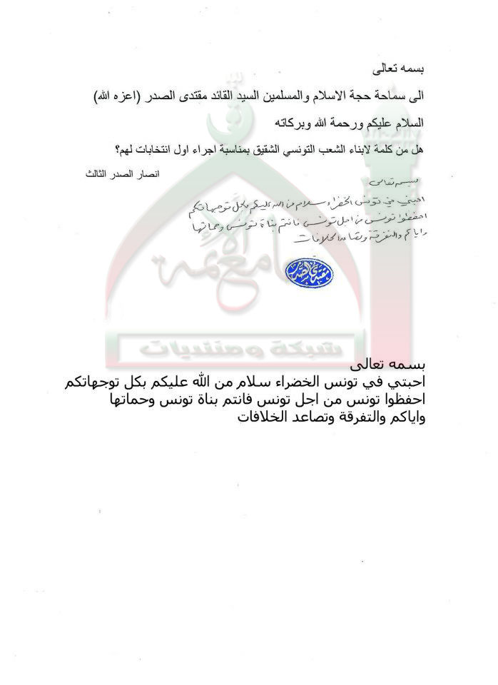 كلمة لابناء الشعب التونسي الشقيق بمناسبة الانتخابات استفتاء للسيد القائد مقتدى الصدر اعزه الله 31 - 10 - 2011