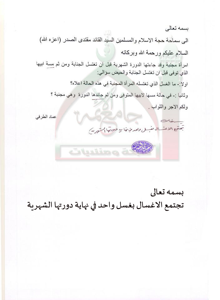 كيفية اداء اغسال متعددة مترتبة في حق المراة استفتاء للسيد القائد مقتدى الصدر اعزه الله 31 - 10 - 2011