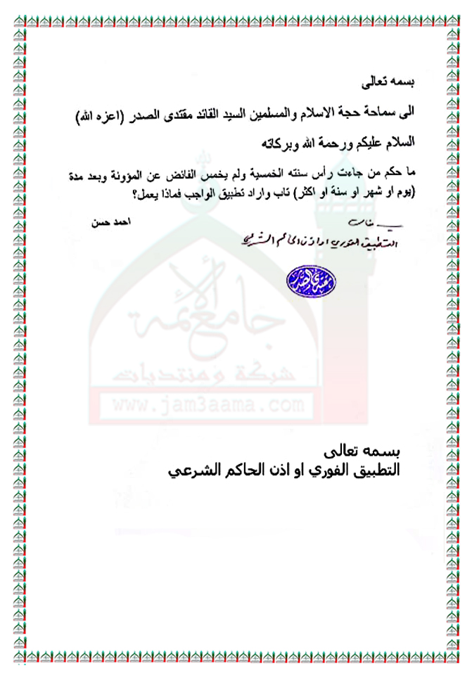 من جاءت راس سنته الخمسية ولم يخمّس الفائض من مؤنته استفتاء للسيد القائد مقتدى الصدر اعزه الله 2 - 11 - 2011