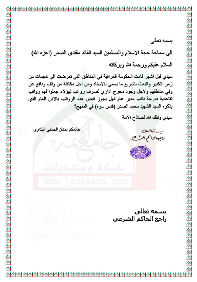 صرف رواتب تقاعدية بدرجة نائب مدير عام لمنتسبي مجالس الاسناد استفتاء للسيد القائد مقتدى الصدر اعزه الله 2 - 11 - 2011