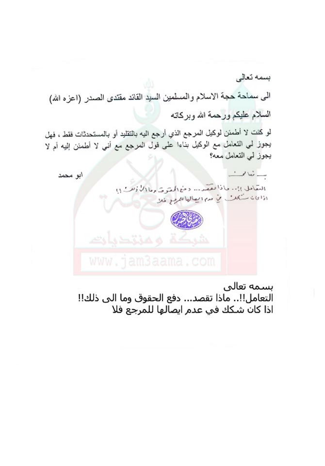 دفع الحقوق الشرعية استفتاء للسيد القائد مقتدى الصدر اعزه الله 4 - 11 - 2011