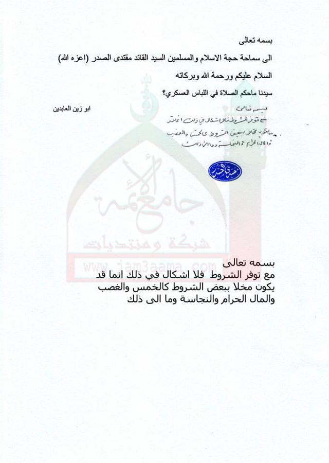 الصلاة في اللباس العسكري استفتاء للسيد القائد مقتدى الصدر اعزه الله 6 - 11 - 2011