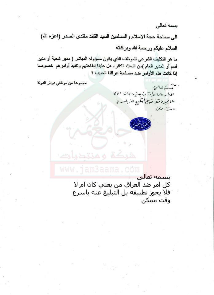 كيفية التعامل مع اوامر المسؤول اذا كانت ضد مصلحة البلد استفتاء للسيد القائد مقتدى الصدر اعزه الله 7 - 11 - 2011