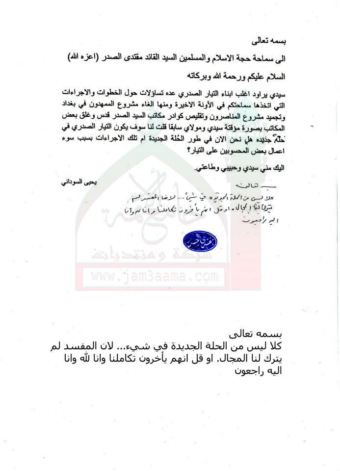 الاجراءات الاخيرة التي قام بها سماحته استفتاء للسيد القائد مقتدى الصدر اعزه الله 7 - 11 - 2011