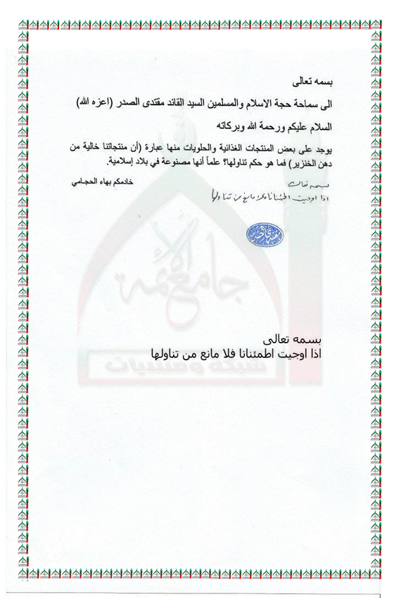 الاطعمة المستوردة من بلاد اسلامية استفتاء للسيد القائد مقتدى الصدر اعزه الله 8 - 11 - 2011