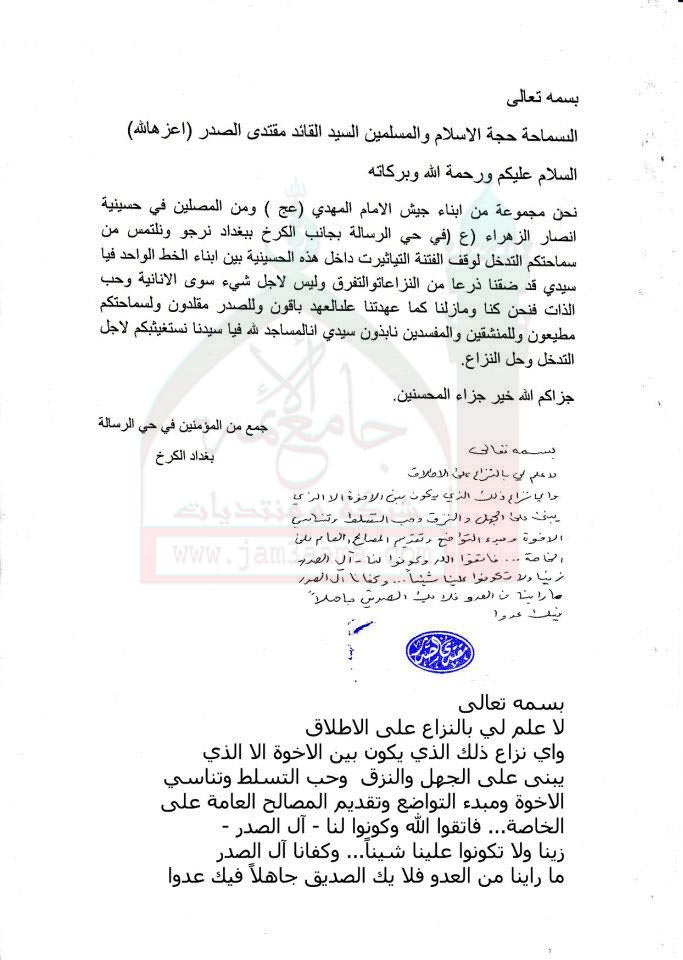 التنازع والتناحر في حسينية الزهراء ع في حي الرسالة استفتاء السيد القائد مقتدى الصدر 9 _ 11 _ 2011