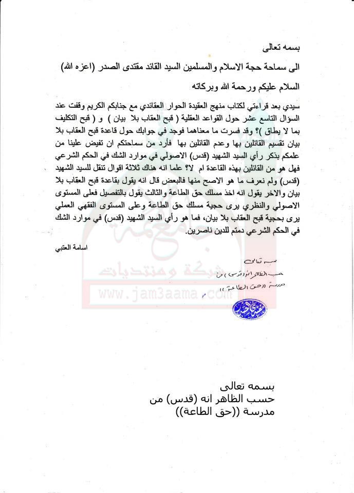القاعدة الاصولية التي يعمل بها السيد الشهيد ( قدس ) في مورد الشك في الحكم الشرعي استفتاء السيد القائد مقتدى الصدر أعزه الله 12-11-2011