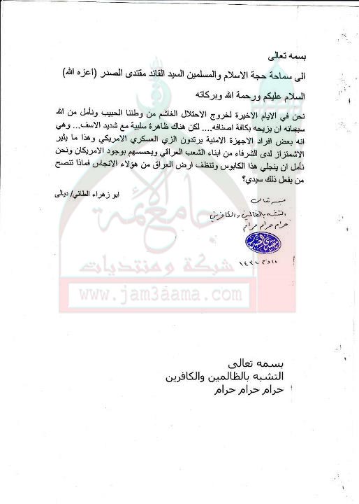 ارتداء لباس قوات الاحتلال استفتاء السيد القائد مقتدى الصدر أعزه الله 12-11-2011