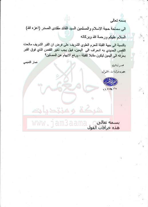 اتجاه القبلة في الحرم الحيدري الشريف على فرض انحراف القبر عن القفص الحديدي استفتاء السيد القائد مقتدى الصدر أعزه الله 12-11-2011