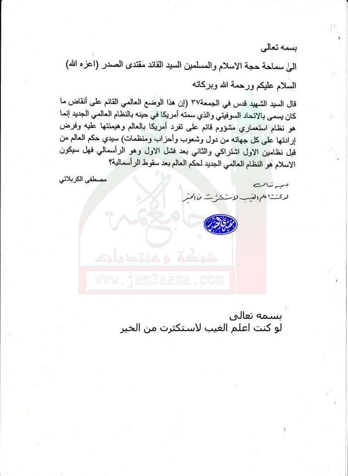 النظام العالمي لحكم العالم بعد سقوط الرأسمالية استفتاء السيد القائد مقتدى الصدر أعزه الله 15-11-2011