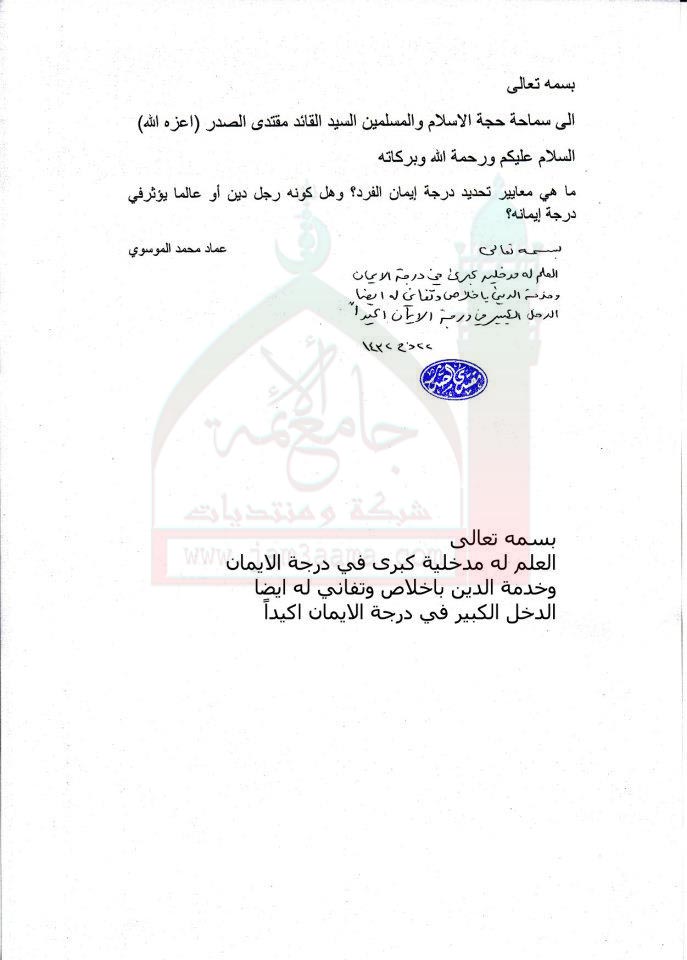 معايير تحديد درجة ايمان الفرد استفتاء للسيد القائد مقتدى الصدر اعزه الله 20- 11 - 2011