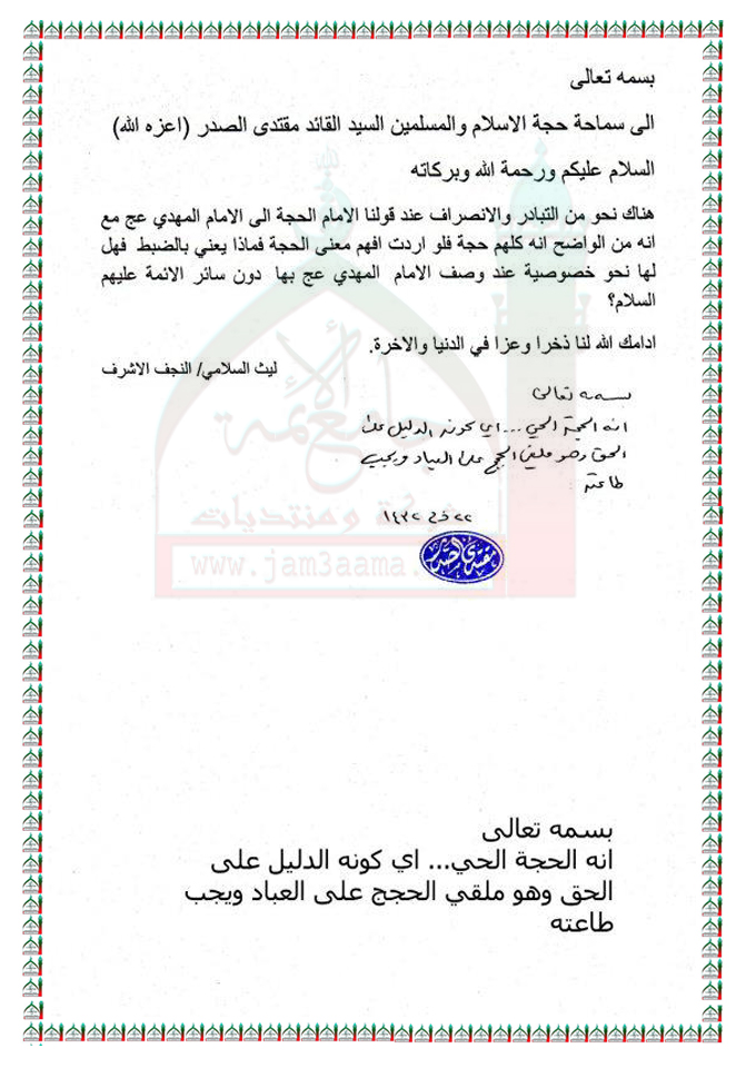 التلازم بين قولنا "الامام الحجة" والامام المهدي عليه السلام استفتاء للسيد القائد مقتدى الصدر اعزه الله 20- 11 - 2011