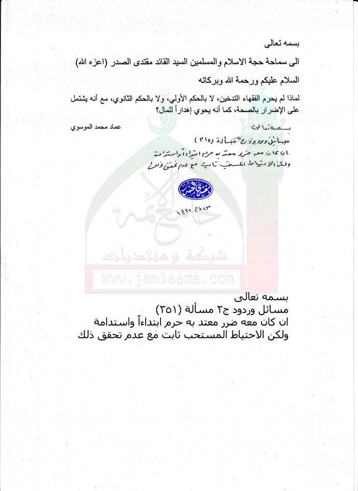 التدخين وعدم تحريم الفقهاء له استفتاء للسيد القائد مقتدى الصدر اعزه الله 20- 11 - 2011