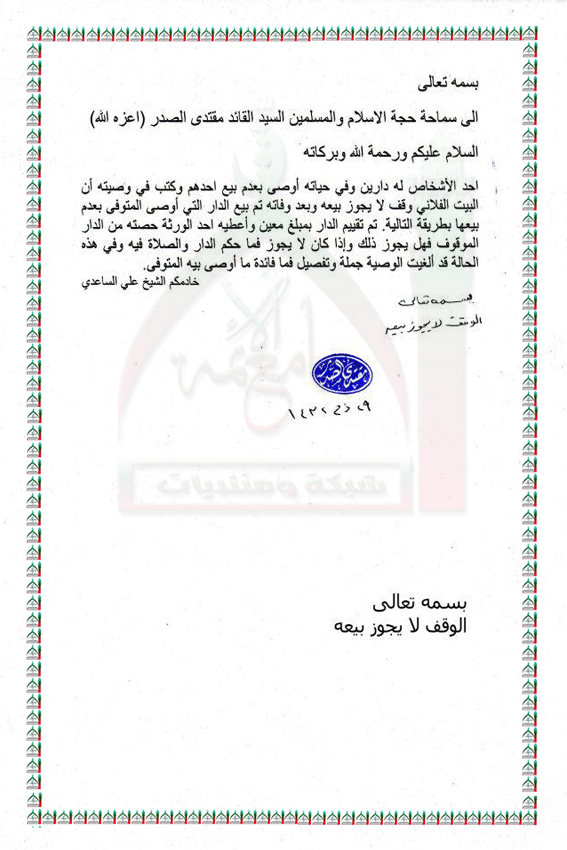 البيت الموقوف لا يجوز بيعه استفتاء للسيد القائد مقتدى الصدر اعزه الله 27- 11 - 2011
