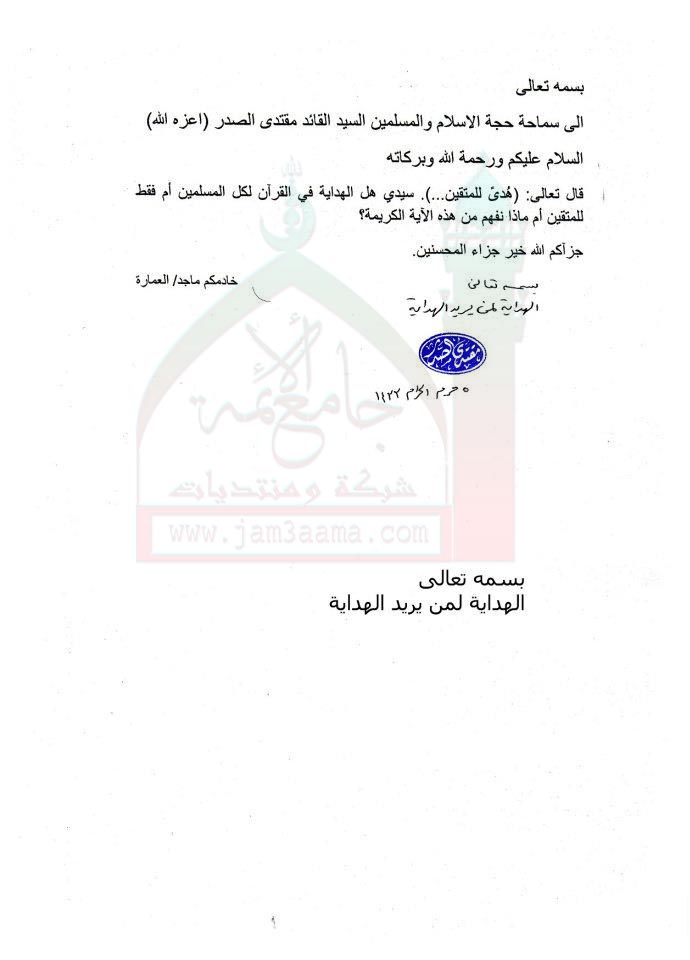 المراد من الهداية في قوله تعالى"هدى للمتقين ..."استفتاء السيد القائد مقتدى الصدر اعزه الله 2 - 12 - 2011