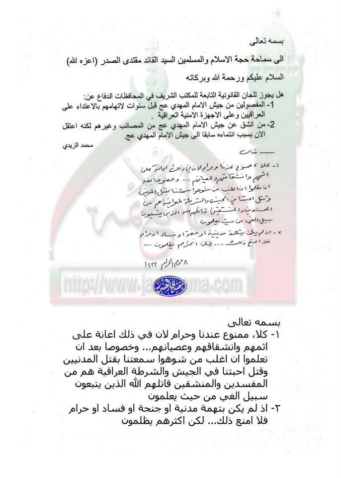اللجان القانونية التابعة للمكتب الشريف ودفاعها عن المفصولين من جيش المهدي استفتاء السيد القائد مقتدى الصدر اعزه الله 4- 12 - 2011
