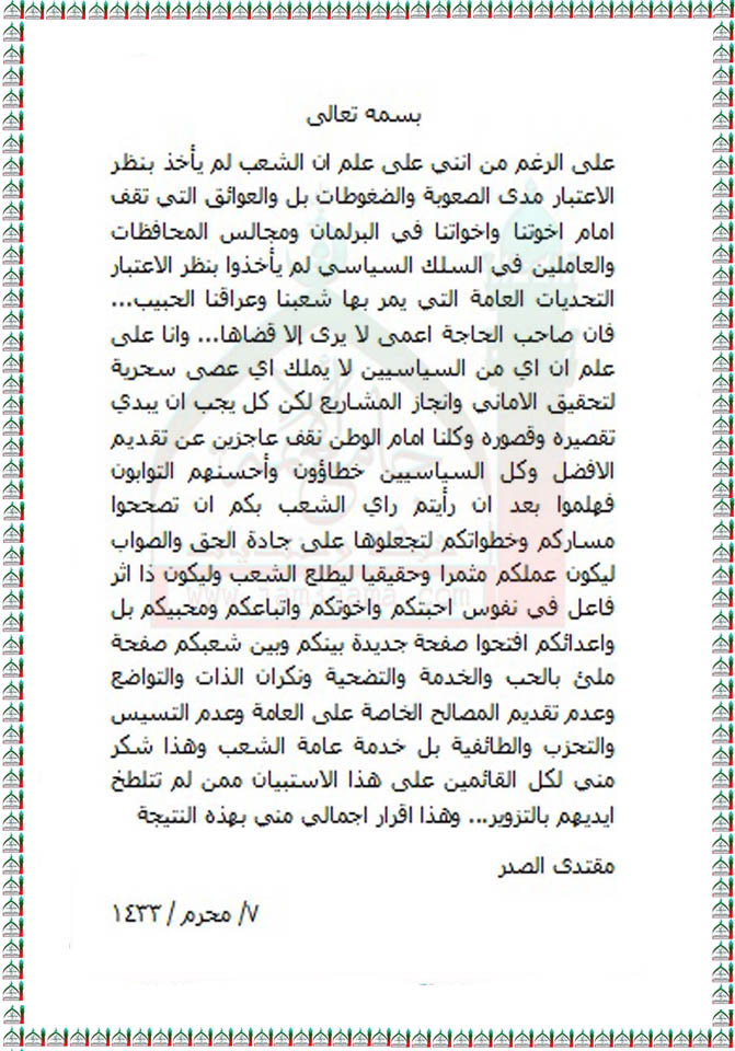 نتائج الاستبيان الشعبي استفتاء السيد القائد مقتدى الصدر اعزه الله 7 - 12 - 2011