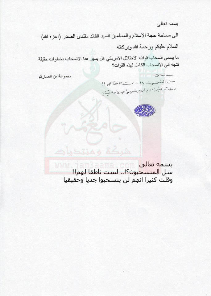 قلت كثيرا ان الاميركان لن ينسحبوا جديا وحقيقيا استفتاء السيد القائد مقتدى الصدر اعزه الله 8 - 12 - 2011