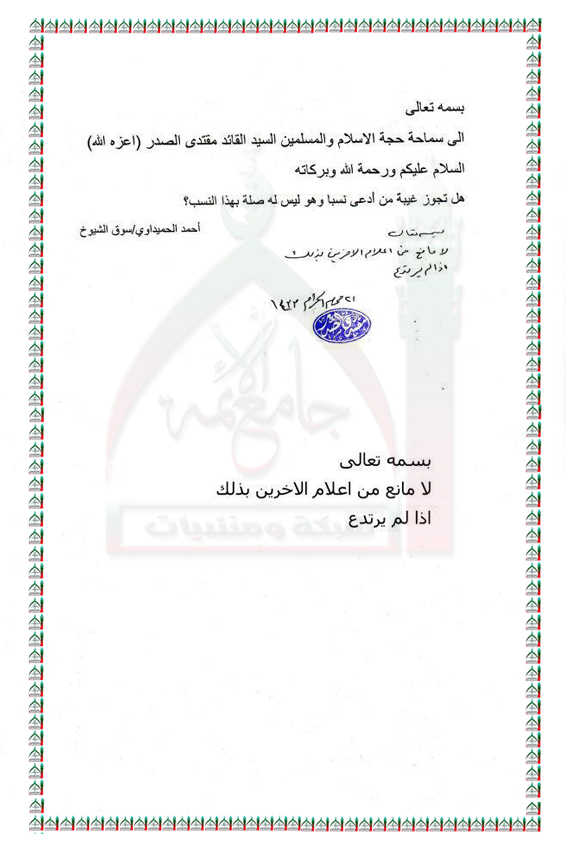 غيبة من ادعى نسباً وليس له صلة بهذا النسب استفتاء السيد القائد مقتدى الصدر بتاريخ 18-12-2011