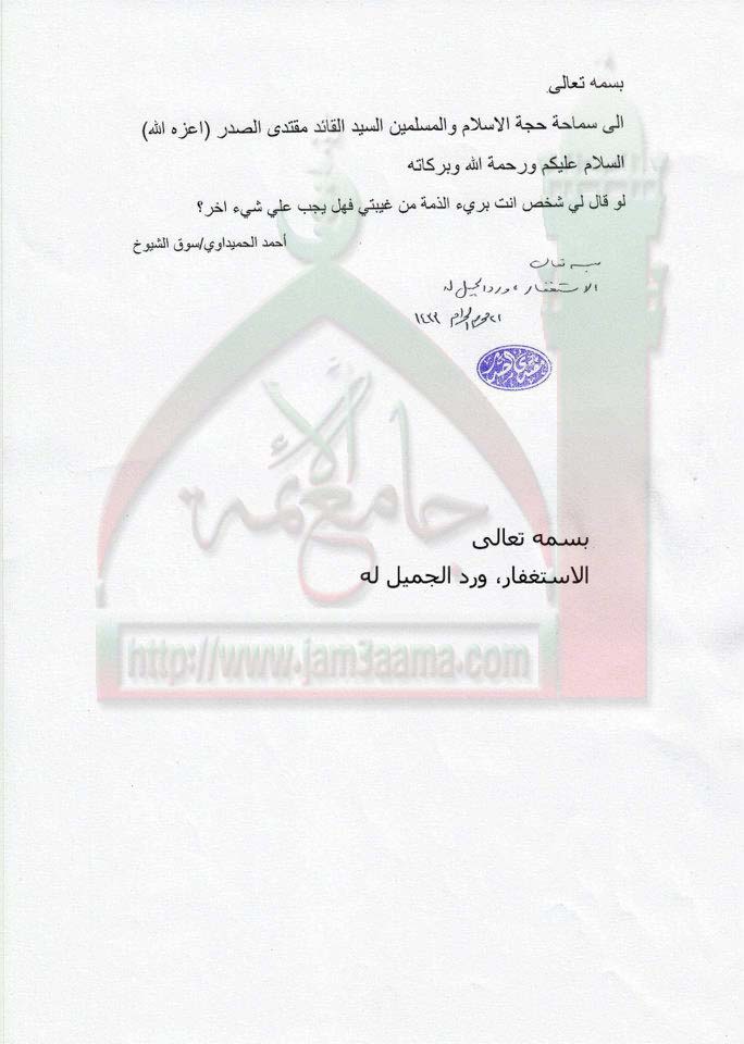 الاستغفار ورد الجميل لشخص قال لك انت بريء الذمة من غيبتي استفتاء السيد القائد مقتدى الصدر بتاريخ 18-12-2011