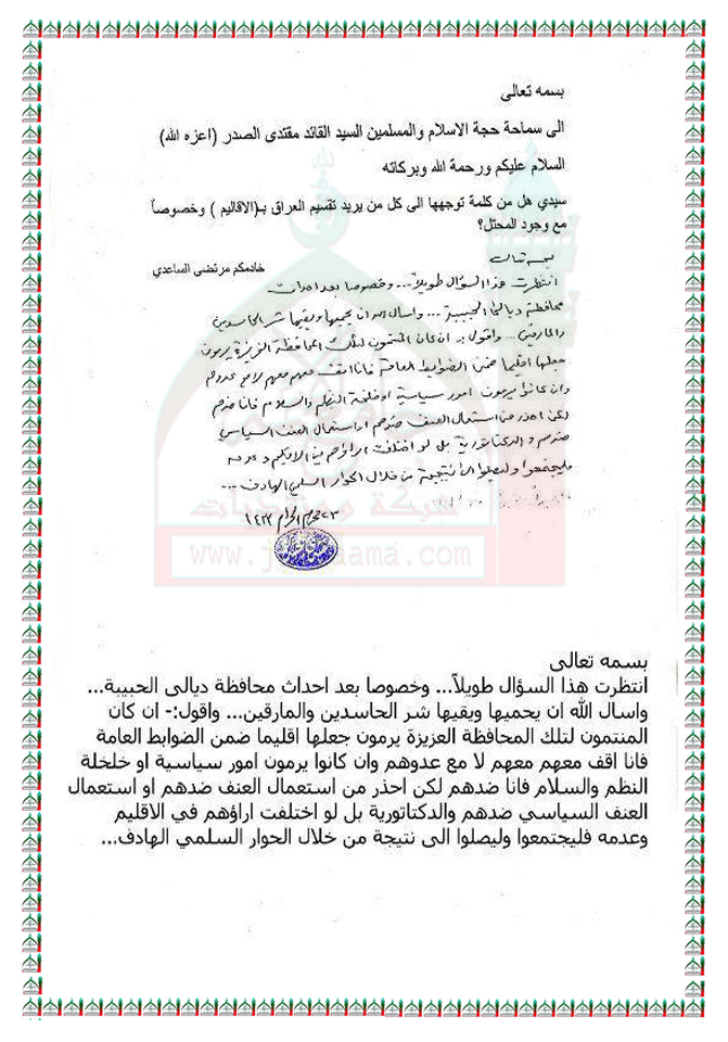 الى من يريد تقسيم العراق الى اقاليم استفتاء السيد القائد مقتدى الصدر اعزه الله 20 - 12 - 2011