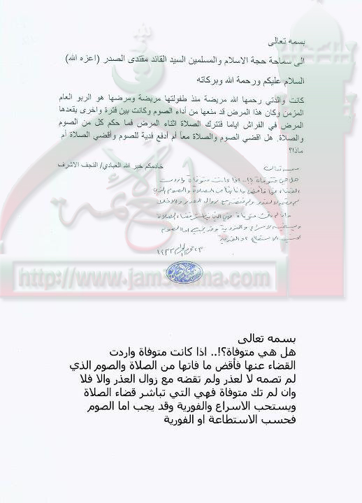 قضاء الصوم والصلاة استفتاء السيد القائد مقتدى الصدر اعزه الله 20 - 12 - 2011