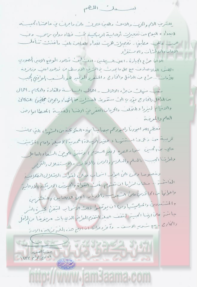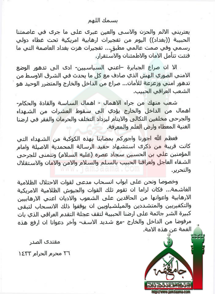 تفجيرات بغداد الارهابية الاميركية بيان السيد القائد مقتدى الصدر اعزه الله 22 - 12 - 2011