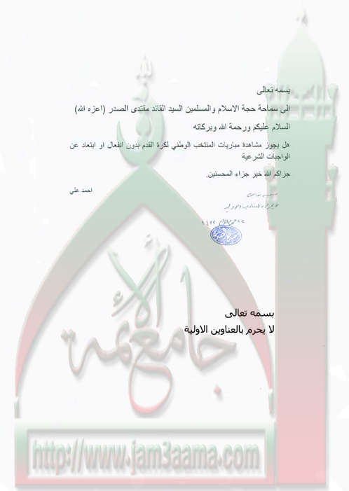 مشاهدة مباريات كرة القدم بدون انفعال او ابتعاد عن الواجبات الشرعية استفتاء السيد القائد مقتدى الصدر اعزه الله 23 - 12 - 2011