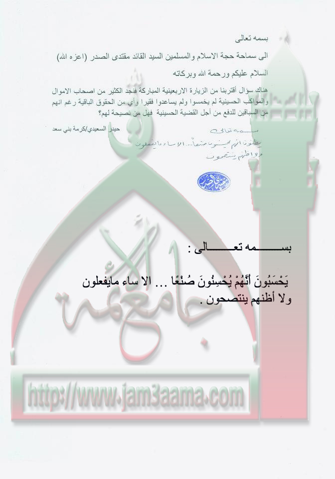 اصحاب الاموال والمواكب الحسينية وعدم تخميس اموالهم استفتاء السيد القائد مقتدى الصدر اعزه الله 23-12-2011