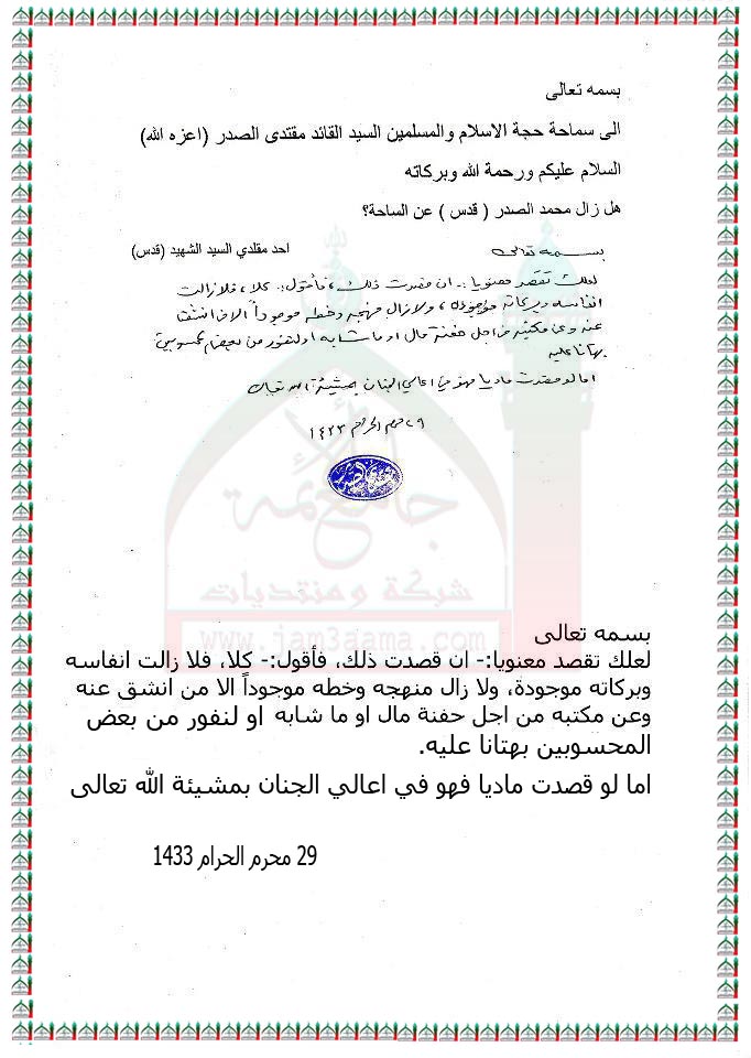 هل زال محمد الصدر قدس عن الساحة؟ استفتاء السيد القائد مقتدى الصدر اعزه الله 26 - 12 - 2011