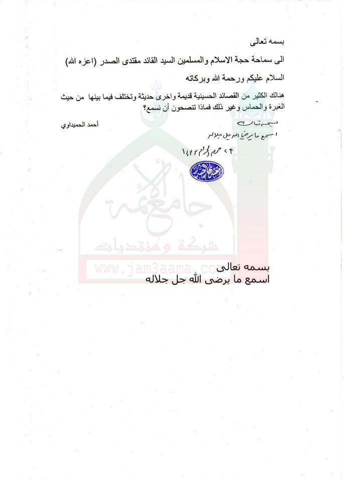 سماع ما يرضي الله من القصائد الحسينية استفتاء السيد القائد مقتدى الصدر اعزه الله 26 - 12 - 2011