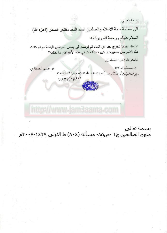 حكم شراء السمك الميت في احواض باعة الاسماك استفتاء السيد القائد مقتدى الصدر اعزه الله 26 - 12 - 2011