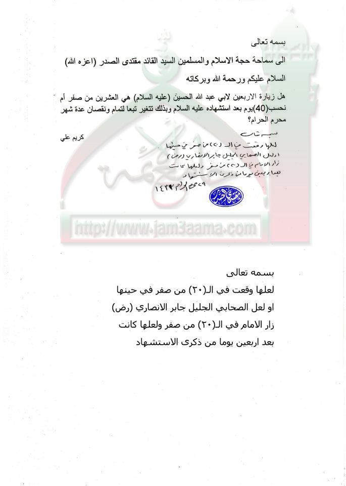 وقت زيارة الاربعين استفتاء السيد القائد مقتدى الصدر اعزه الله 26 - 12 - 2011