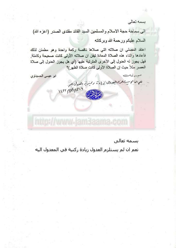 اعادة الصلاة اليومية لاعتقاد الخلل فيها استفتاء السيد القائد مقتدى الصدر اعزه الله 26 - 12 - 2011