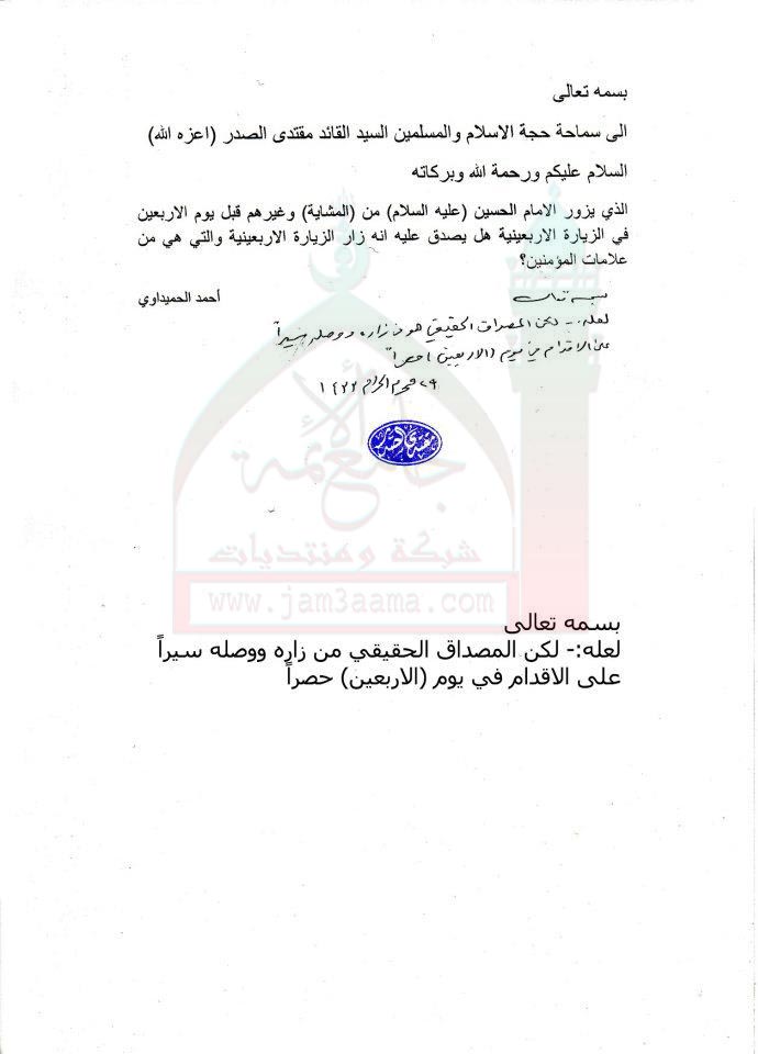 صدق الزيارة لمن زار الحسين ع من المشاية قبل يوم الاربعين استفتاء السيد القائد مقتدى الصدر اعزه الله 26 - 12 - 2011
