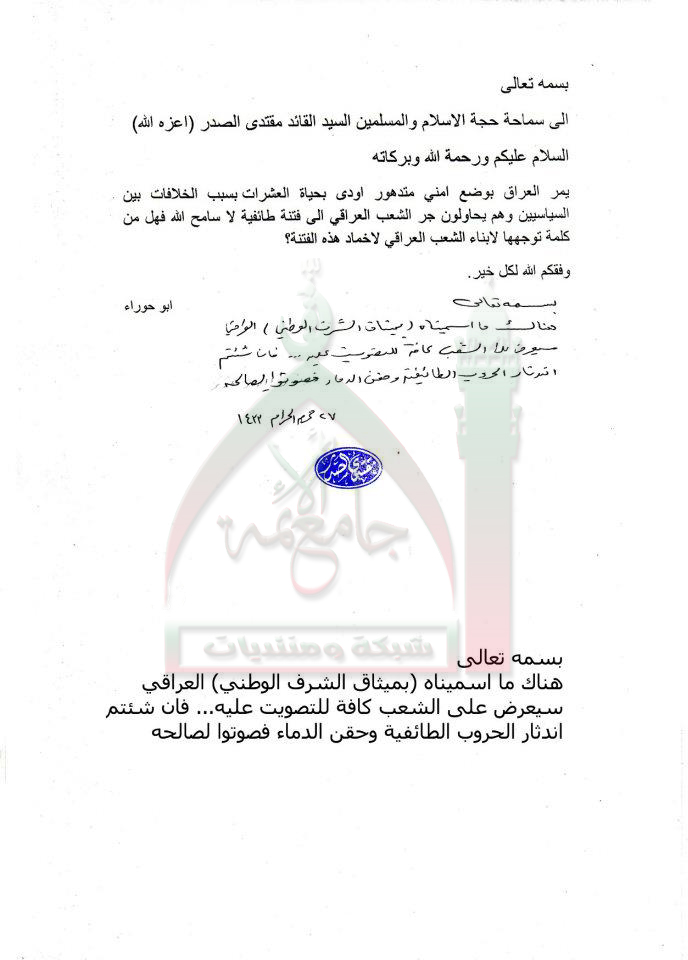 ان شئتم اندثار الحروب الطائفية وحقن الدماء فصوتوا لصالح ميثاق الشرف الوطني استفتاء السيد القائد مقتدى الصدر اعزه الله 26 - 12 - 2011