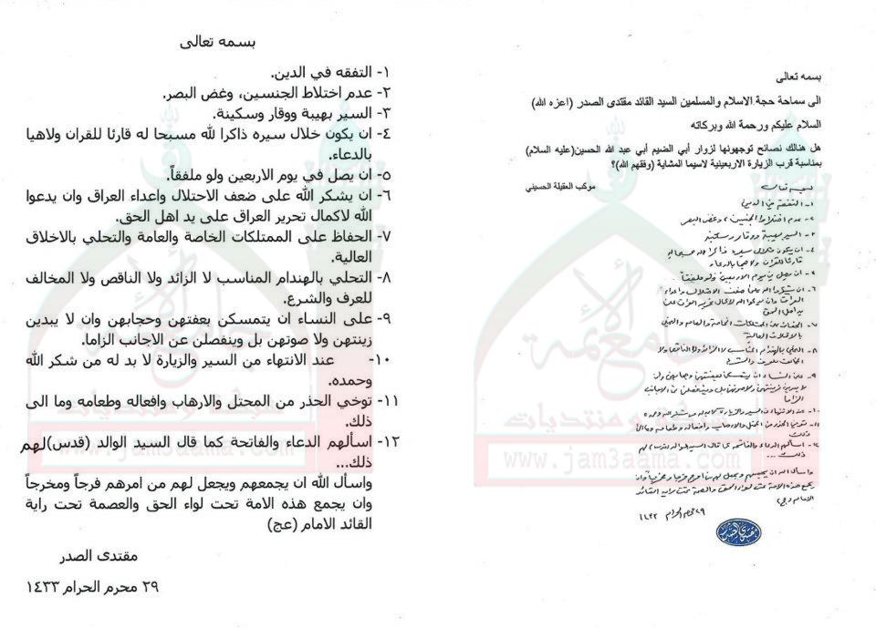 نصائح الى السائرين للامام الحسين ع في زيارة الاربعين استفتاء السيد القائد مقتدى الصدر اعزه الله 26 - 12 - 2011
