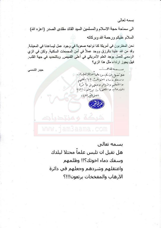المغتربين وارتداء الزي الرسمي للعمل والذي يحمل العلم الإمريكي استفتاء السيد مقتدى الصدر اعزه الله 27-12-2011