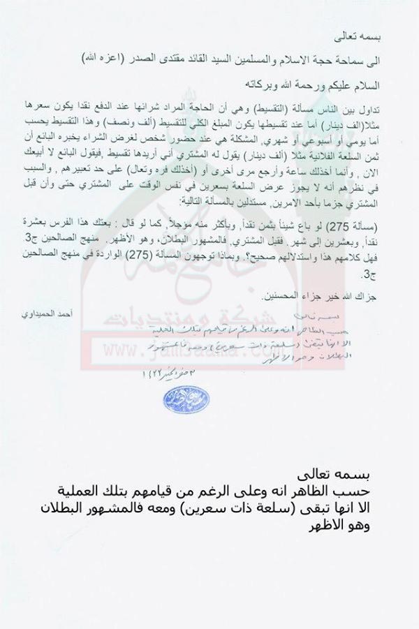 البيع بطريقة التقسيط استفتاء السيد القائد مقتدى الصدر اعزه الله 29- 12 - 2011