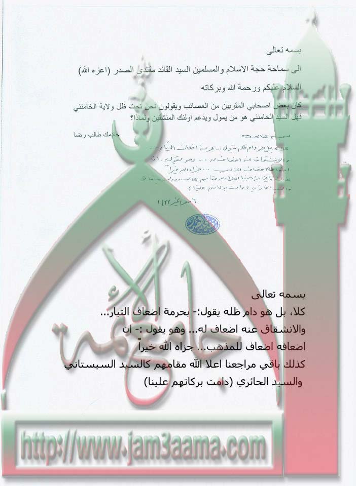 رد: السيد الخامنئي دام ظله يقول بحرمة اضعاف التيارالصدري وان اضعافه اضعاف للمذهب استفتاء السيد القائد مقتدى الصدر اعزه الله 1 - 1 - 2012
