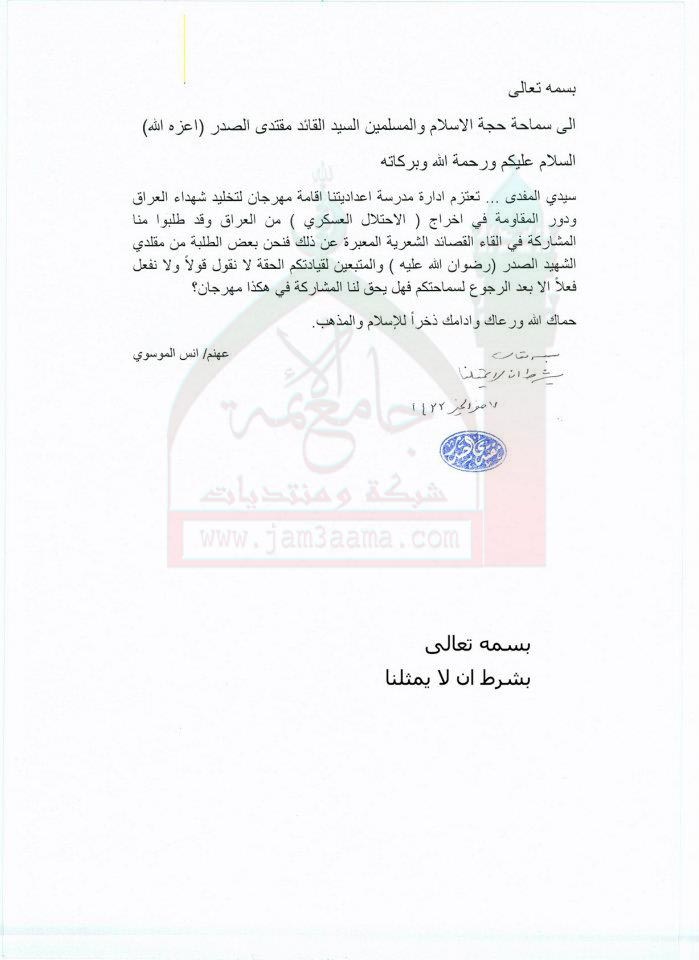 مهرجان لتخليد شهداء العراق ودور المقاومة في احد المدارس الاعدادية استفتاء السيد القائد مقتدى الصدر اعزه الله 2 - 1 - 2012