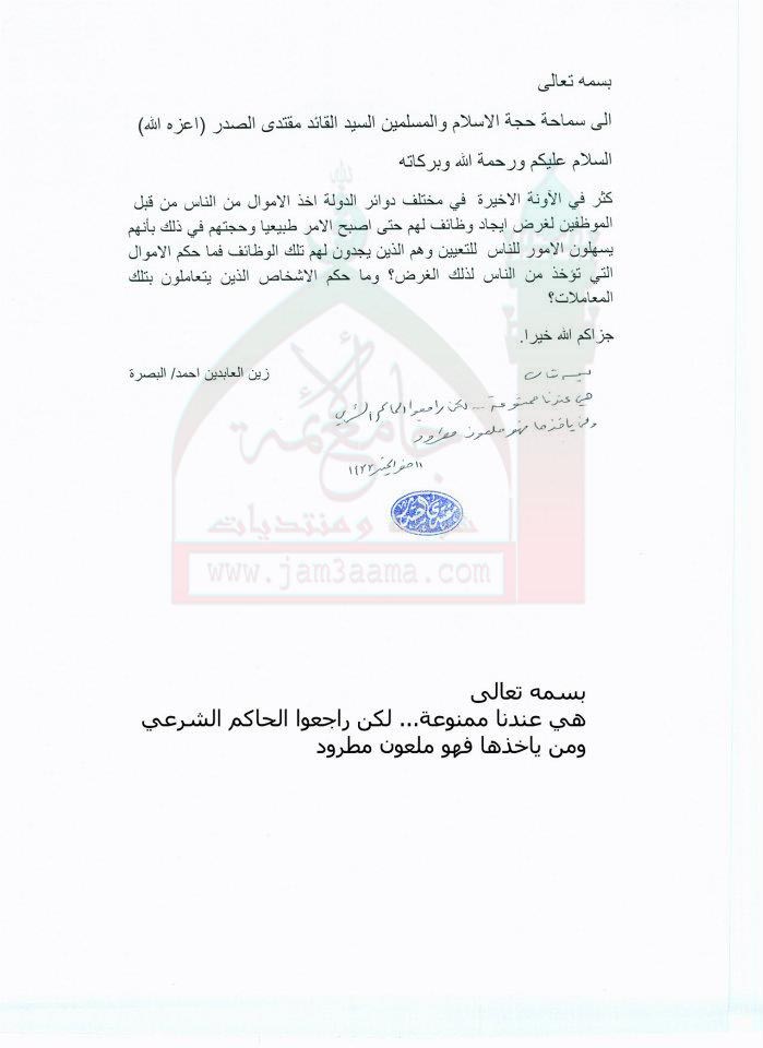 اخذ الاموال من الناس لغرض تعيينهم استفتاء السيد القائد مقتدى الصدر اعزه الله 7 - 1 - 2012