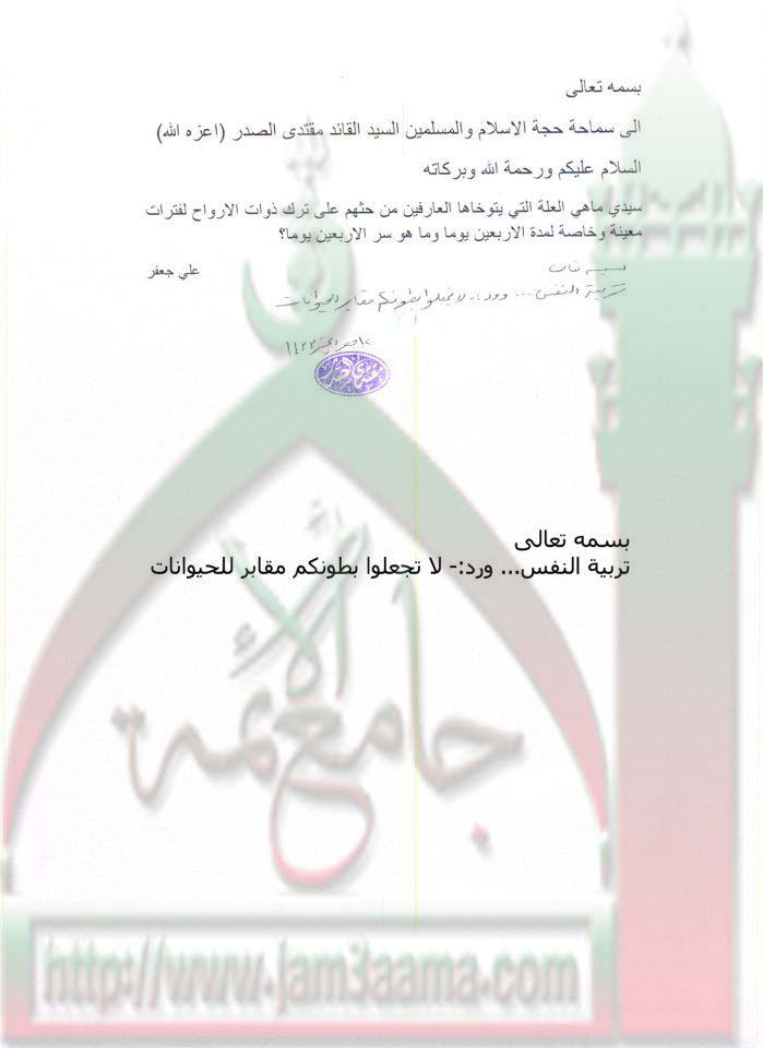 العلة في ترك العارفين اكل ذوات الارواح لاربعين يوما استفتاء السيد القائد مقتدى الصدر اعزه الله 7 - 1 - 2012