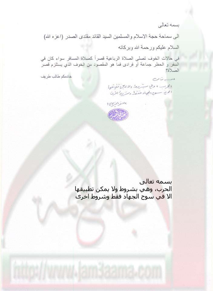 المقصود من الخوف الذي يستلزم قصر الصلاة استفتاء السيد القائد مقتدى الصدر اعزه الله 7 - 1 - 2012