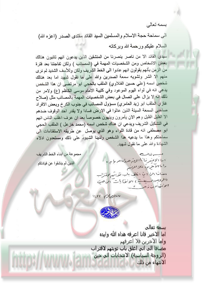 ادّعاء بعض المنشقين للتوبة ورجوعهم للخط الشريف استفتاء السيد القائد مقتدى الصدر اعزه الله 8-1-2012