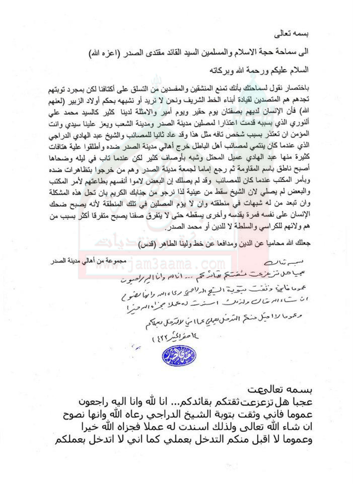 وثقت بتوبة الشيخ عبد الهادي الدراجي رعاه الله ولذلك اسندت له عملا استفتاء السيد القائد مقتدى الصدر اعزه الله 9 - 1 - 2012