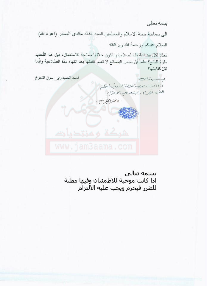 الالتزام بمدة صلاحية البضاعة المباعة اذا كان فيها مظنة للضرر استفتاء السيد القائد مقتدى الصدر اعزه الله 11-1-2012